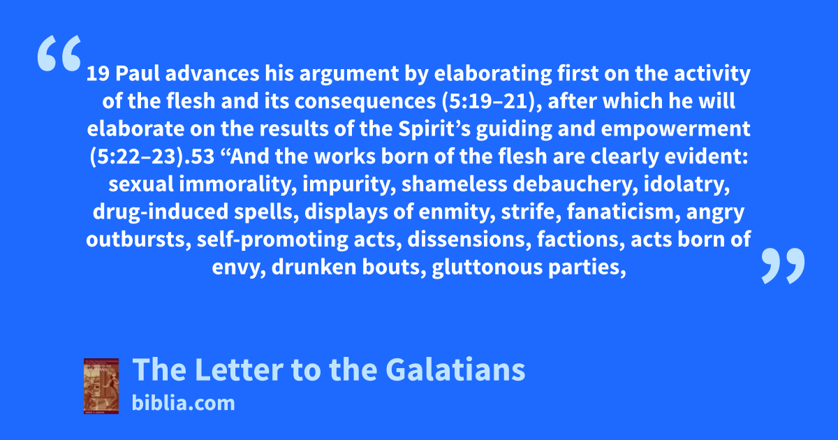 19 Paul advances his argument by elaborating first on the activity of the flesh and its consequences (5:19–21), after which he will elaborate on the results of the Spirit’s guiding and empowerment (5:22–23).53 “And the works born of the flesh are clearly evident: sexual immorality, impurity, shameless debauchery, idolatry, drug-induced spells, displays of enmity, strife, fanaticism, angry outbursts, self-promoting acts, dissensions, factions, acts born of envy, drunken bouts, gluttonous parties,