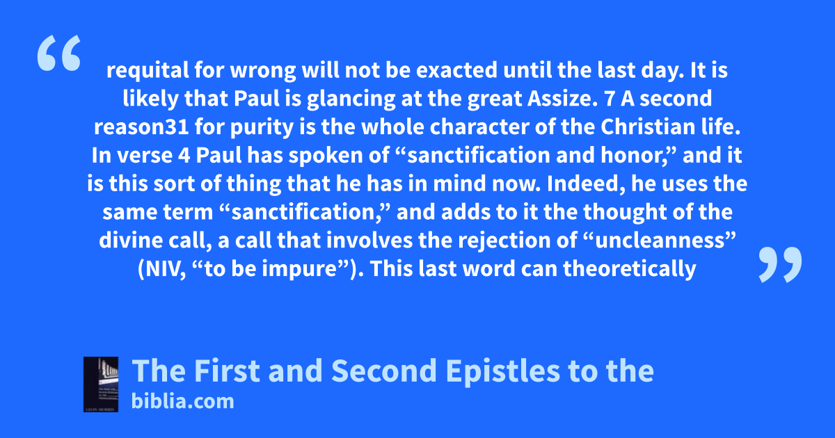 requital for wrong will not be exacted until the last day. It is likely that Paul is glancing at the great Assize. 7 A second reason31 for purity is the whole character of the Christian life. In verse 4 Paul has spoken of “sanctification and honor,” and it is this sort of thing that he has in mind now. Indeed, he uses the same term “sanctification,” and adds to it the thought of the divine call, a call that involves the rejection of “uncleanness” (NIV, “to be impure”). This last word can theoretically