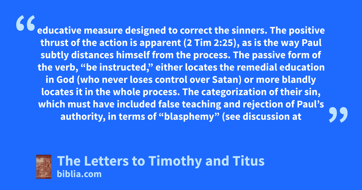 educative measure designed to correct the sinners. The positive thrust of the action is apparent (2 Tim 2:25), as is the way Paul subtly distances himself from the process. The passive form of the verb, “be instructed,” either locates the remedial education in God (who never loses control over Satan) or more blandly locates it in the whole process. The categorization of their sin, which must have included false teaching and rejection of Paul’s authority, in terms of “blasphemy” (see discussion at
