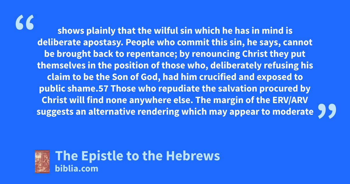 shows plainly that the wilful sin which he has in mind is deliberate apostasy. People who commit this sin, he says, cannot be brought back to repentance; by renouncing Christ they put themselves in the position of those who, deliberately refusing his claim to be the Son of God, had him crucified and exposed to public shame.57 Those who repudiate the salvation procured by Christ will find none anywhere else. The margin of the ERV/ARV suggests an alternative rendering which may appear to moderate