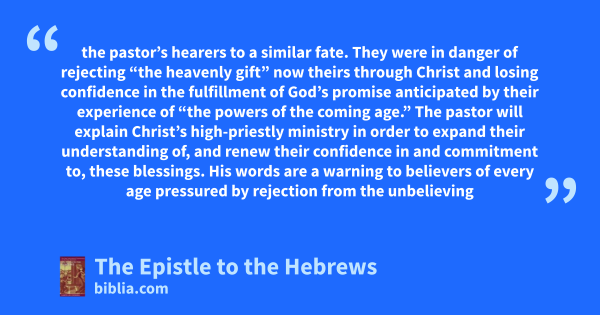 the pastor’s hearers to a similar fate. They were in danger of rejecting “the heavenly gift” now theirs through Christ and losing confidence in the fulfillment of God’s promise anticipated by their experience of “the powers of the coming age.” The pastor will explain Christ’s high-priestly ministry in order to expand their understanding of, and renew their confidence in and commitment to, these blessings. His words are a warning to believers of every age pressured by rejection from the unbelieving