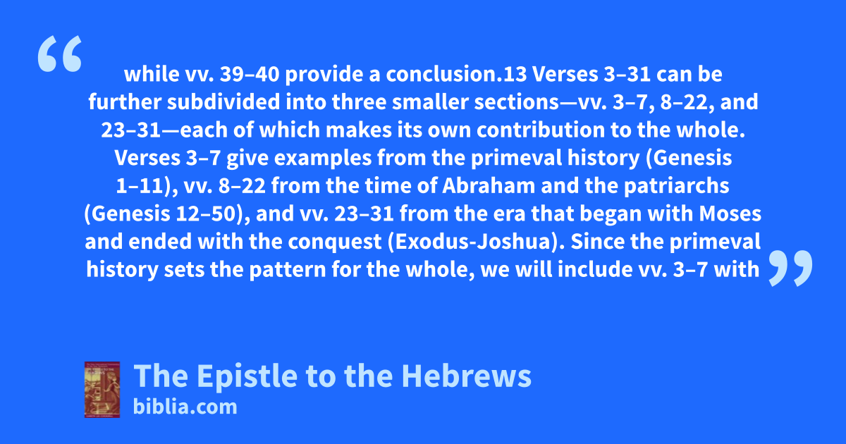 while vv. 39–40 provide a conclusion.13 Verses 3–31 can be further subdivided into three smaller sections—vv. 3–7, 8–22, and 23–31—each of which makes its own contribution to the whole. Verses 3–7 give examples from the primeval history (Genesis 1–11), vv. 8–22 from the time of Abraham and the patriarchs (Genesis 12–50), and vv. 23–31 from the era that began with Moses and ended with the conquest (Exodus-Joshua). Since the primeval history sets the pattern for the whole, we will include vv. 3–7 with