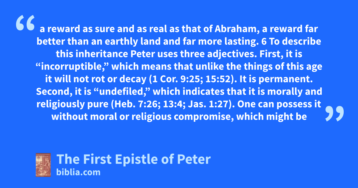 a reward as sure and as real as that of Abraham, a reward far better than an earthly land and far more lasting. 6 To describe this inheritance Peter uses three adjectives. First, it is “incorruptible,” which means that unlike the things of this age it will not rot or decay (1 Cor. 9:25; 15:52). It is permanent. Second, it is “undefiled,” which indicates that it is morally and religiously pure (Heb. 7:26; 13:4; Jas. 1:27). One can possess it without moral or religious compromise, which might be