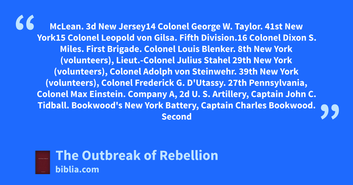 McLean. 3d New Jersey14 Colonel George W. Taylor. 41st New York15 Colonel Leopold von Gilsa. Fifth Division.16 Colonel Dixon S. Miles. First Brigade. Colonel Louis Blenker. 8th New York (volunteers), Lieut.-Colonel Julius Stahel 29th New York (volunteers), Colonel Adolph von Steinwehr. 39th New York (volunteers), Colonel Frederick G. D'Utassy. 27th Pennsylvania, Colonel Max Einstein. Company A, 2d U. S. Artillery, Captain John C. Tidball. Bookwood's New York Battery, Captain Charles Bookwood. Second