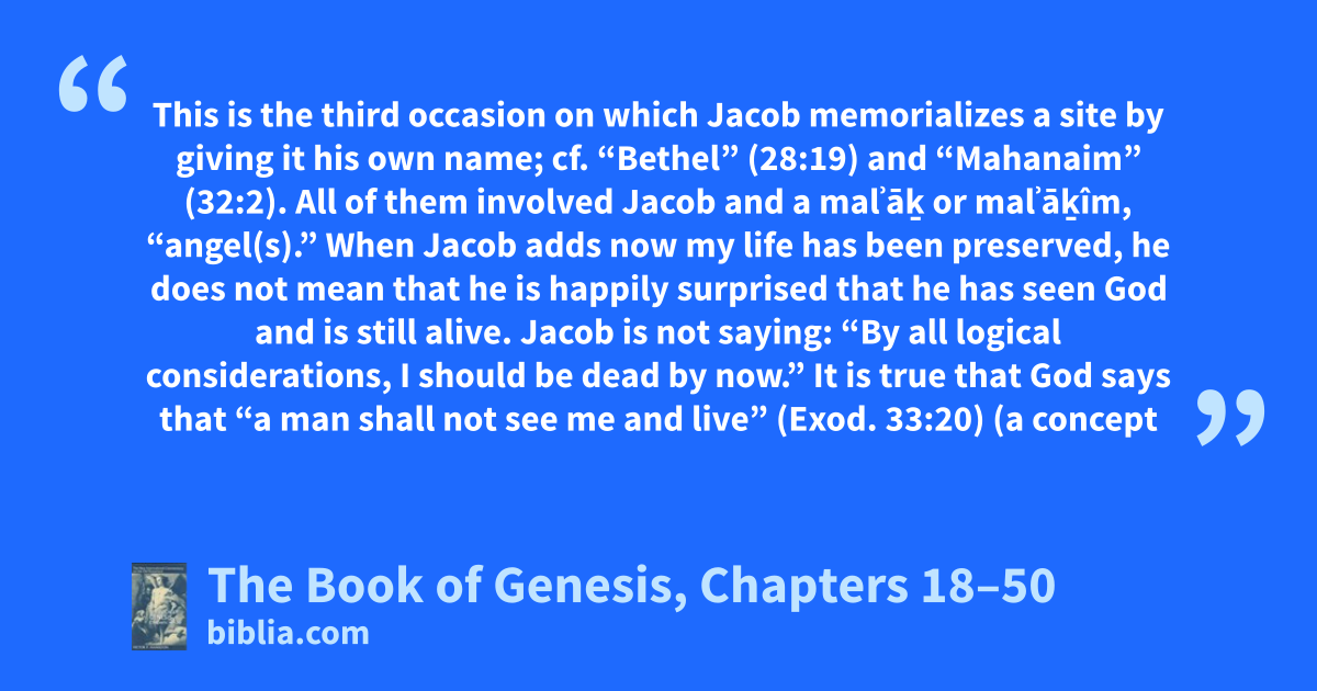 This is the third occasion on which Jacob memorializes a site by giving it his own name; cf. “Bethel” (28:19) and “Mahanaim” (32:2). All of them involved Jacob and a malʾāḵ or malʾāḵîm, “angel(s).” When Jacob adds now my life has been preserved, he does not mean that he is happily surprised that he has seen God and is still alive. Jacob is not saying: “By all logical considerations, I should be dead by now.” It is true that God says that “a man shall not see me and live” (Exod. 33:20) (a concept