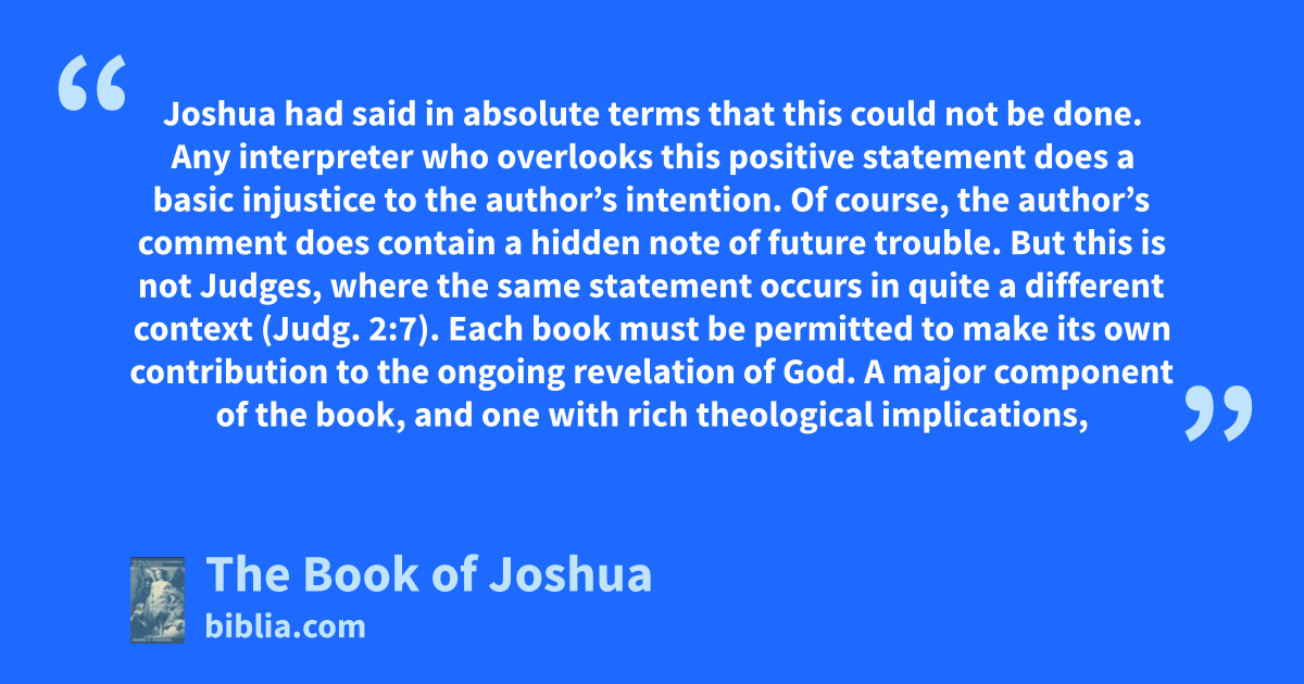 Joshua had said in absolute terms that this could not be done. Any interpreter who overlooks this positive statement does a basic injustice to the author’s intention. Of course, the author’s comment does contain a hidden note of future trouble. But this is not Judges, where the same statement occurs in quite a different context (Judg. 2:7). Each book must be permitted to make its own contribution to the ongoing revelation of God. A major component of the book, and one with rich theological implications,