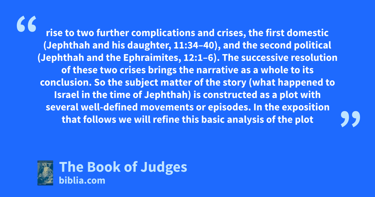 rise to two further complications and crises, the first domestic (Jephthah and his daughter, 11:34–40), and the second political (Jephthah and the Ephraimites, 12:1–6). The successive resolution of these two crises brings the narrative as a whole to its conclusion. So the subject matter of the story (what happened to Israel in the time of Jephthah) is constructed as a plot with several well-defined movements or episodes. In the exposition that follows we will refine this basic analysis of the plot