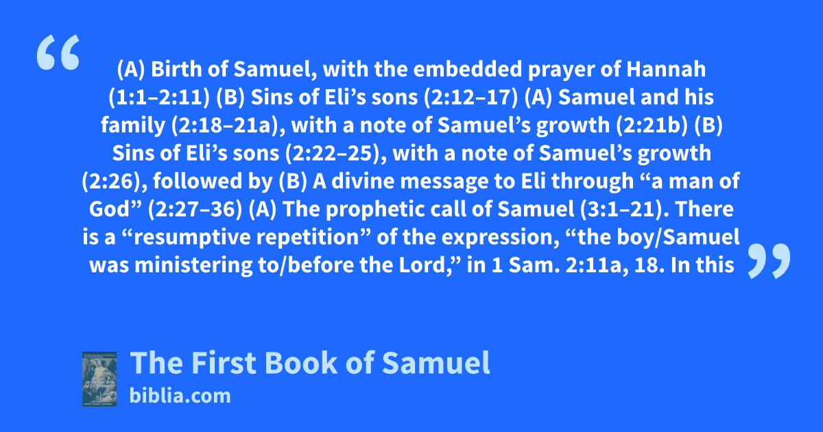 (A) Birth of Samuel, with the embedded prayer of Hannah (1:1–2:11) (B) Sins of Eli’s sons (2:12–17) (A) Samuel and his family (2:18–21a), with a note of Samuel’s growth (2:21b) (B) Sins of Eli’s sons (2:22–25), with a note of Samuel’s growth (2:26), followed by (B) A divine message to Eli through “a man of God” (2:27–36) (A) The prophetic call of Samuel (3:1–21). There is a “resumptive repetition” of the expression, “the boy/Samuel was ministering to/before the Lord,” in 1 Sam. 2:11a, 18. In this