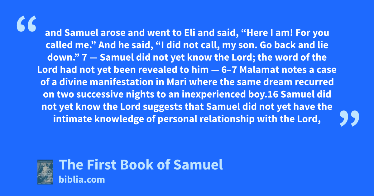and Samuel arose and went to Eli and said, “Here I am! For you called me.” And he said, “I did not call, my son. Go back and lie down.” 7 — Samuel did not yet know the Lord; the word of the Lord had not yet been revealed to him — 6–7 Malamat notes a case of a divine manifestation in Mari where the same dream recurred on two successive nights to an inexperienced boy.16 Samuel did not yet know the Lord suggests that Samuel did not yet have the intimate knowledge of personal relationship with the Lord,