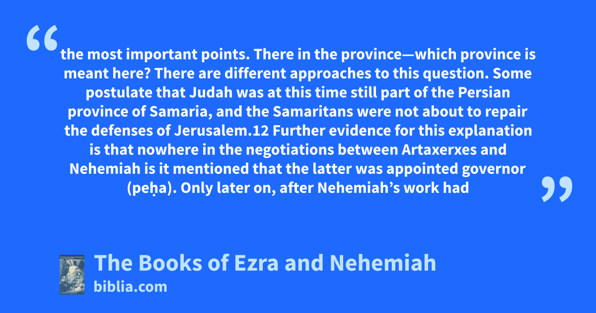 the most important points. There in the province—which province is meant here? There are different approaches to this question. Some postulate that Judah was at this time still part of the Persian province of Samaria, and the Samaritans were not about to repair the defenses of Jerusalem.12 Further evidence for this explanation is that nowhere in the negotiations between Artaxerxes and Nehemiah is it mentioned that the latter was appointed governor (peḥa). Only later on, after Nehemiah’s work had