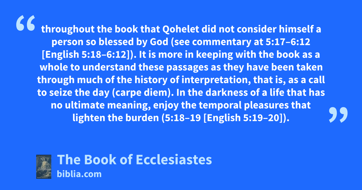 throughout the book that Qohelet did not consider himself a person so blessed by God (see commentary at 5:17–6:12 [English 5:18–6:12]). It is more in keeping with the book as a whole to understand these passages as they have been taken through much of the history of interpretation, that is, as a call to seize the day (carpe diem). In the darkness of a life that has no ultimate meaning, enjoy the temporal pleasures that lighten the burden (5:18–19 [English 5:19–20]).