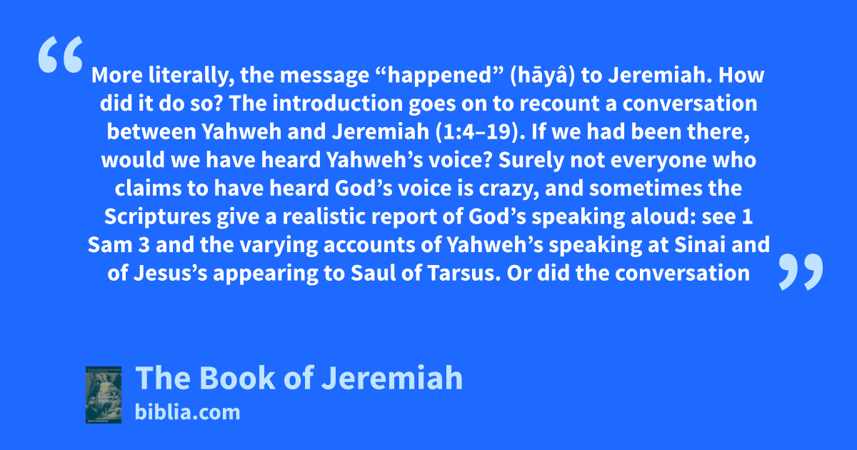 More literally, the message “happened” (hāyâ) to Jeremiah. How did it do so? The introduction goes on to recount a conversation between Yahweh and Jeremiah (1:4–19). If we had been there, would we have heard Yahweh’s voice? Surely not everyone who claims to have heard God’s voice is crazy, and sometimes the Scriptures give a realistic report of God’s speaking aloud: see 1 Sam 3 and the varying accounts of Yahweh’s speaking at Sinai and of Jesus’s appearing to Saul of Tarsus. Or did the conversation