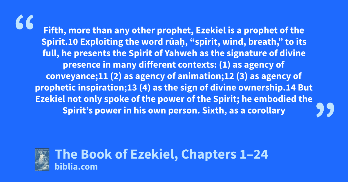 Fifth, more than any other prophet, Ezekiel is a prophet of the Spirit.10 Exploiting the word rûaḥ, “spirit, wind, breath,” to its full, he presents the Spirit of Yahweh as the signature of divine presence in many different contexts: (1) as agency of conveyance;11 (2) as agency of animation;12 (3) as agency of prophetic inspiration;13 (4) as the sign of divine ownership.14 But Ezekiel not only spoke of the power of the Spirit; he embodied the Spirit’s power in his own person. Sixth, as a corollary