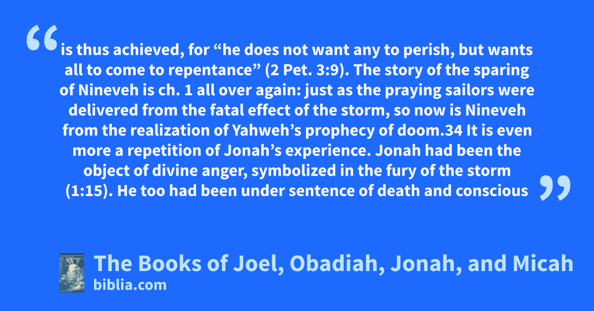 is thus achieved, for “he does not want any to perish, but wants all to come to repentance” (2 Pet. 3:9). The story of the sparing of Nineveh is ch. 1 all over again: just as the praying sailors were delivered from the fatal effect of the storm, so now is Nineveh from the realization of Yahweh’s prophecy of doom.34 It is even more a repetition of Jonah’s experience. Jonah had been the object of divine anger, symbolized in the fury of the storm (1:15). He too had been under sentence of death and conscious