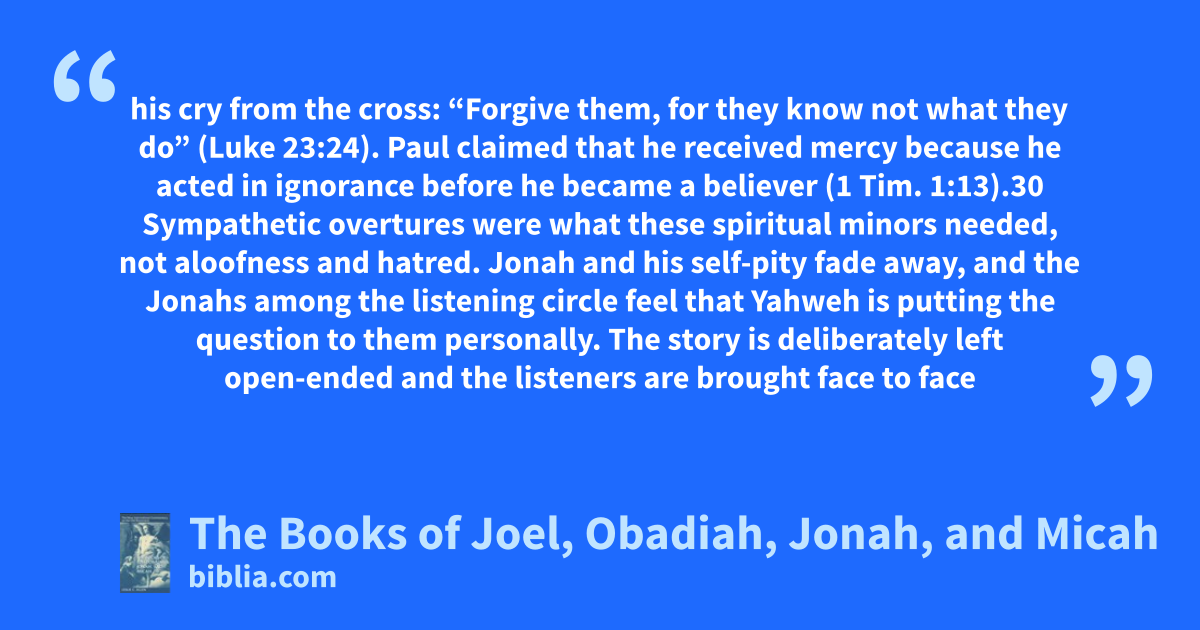 his cry from the cross: “Forgive them, for they know not what they do” (Luke 23:24). Paul claimed that he received mercy because he acted in ignorance before he became a believer (1 Tim. 1:13).30 Sympathetic overtures were what these spiritual minors needed, not aloofness and hatred. Jonah and his self-pity fade away, and the Jonahs among the listening circle feel that Yahweh is putting the question to them personally. The story is deliberately left open-ended and the listeners are brought face to face