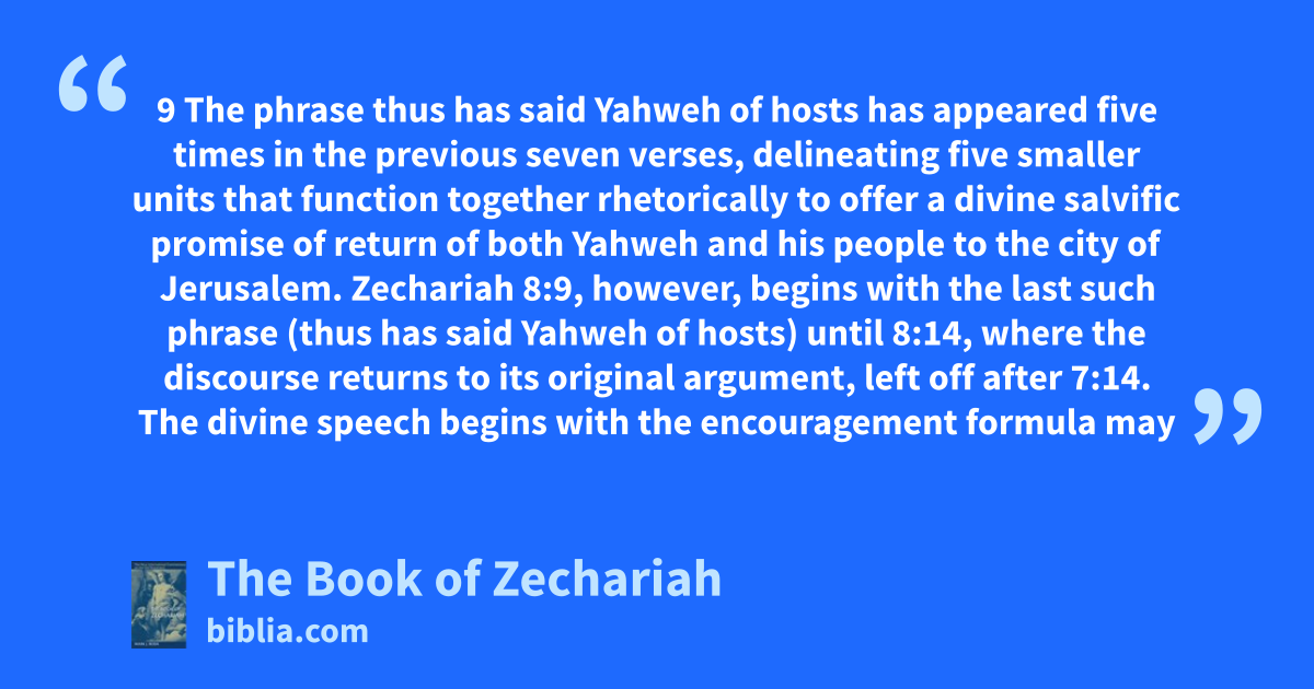 9 The phrase thus has said Yahweh of hosts has appeared five times in the previous seven verses, delineating five smaller units that function together rhetorically to offer a divine salvific promise of return of both Yahweh and his people to the city of Jerusalem. Zechariah 8:9, however, begins with the last such phrase (thus has said Yahweh of hosts) until 8:14, where the discourse returns to its original argument, left off after 7:14. The divine speech begins with the encouragement formula may