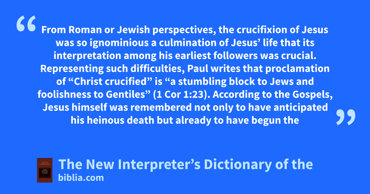From Roman or Jewish perspectives, the crucifixion of Jesus was so ignominious a culmination of Jesus’ life that its interpretation among his earliest followers was crucial. Representing such difficulties, Paul writes that proclamation of “Christ crucified” is “a stumbling block to Jews and foolishness to Gentiles” (1 Cor 1:23). According to the Gospels, Jesus himself was remembered not only to have anticipated his heinous death but already to have begun the