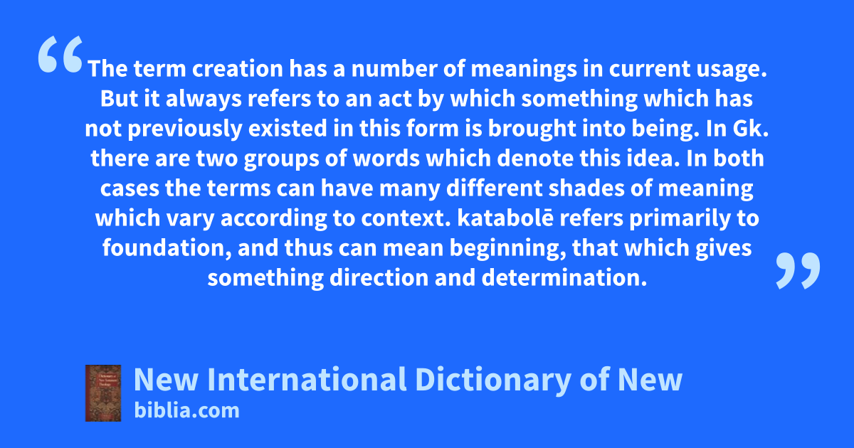 The term creation has a number of meanings in current usage. But it always refers to an act by which something which has not previously existed in this form is brought into being. In Gk. there are two groups of words which denote this idea. In both cases the terms can have many different shades of meaning which vary according to context. katabolē refers primarily to foundation, and thus can mean beginning, that which gives something direction and determination.