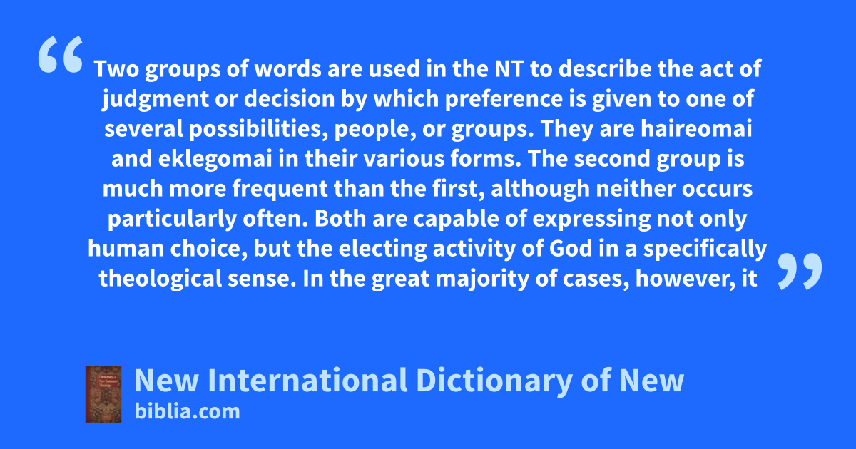 Two groups of words are used in the NT to describe the act of judgment or decision by which preference is given to one of several possibilities, people, or groups. They are haireomai and eklegomai in their various forms. The second group is much more frequent than the first, although neither occurs particularly often. Both are capable of expressing not only human choice, but the electing activity of God in a specifically theological sense. In the great majority of cases, however, it