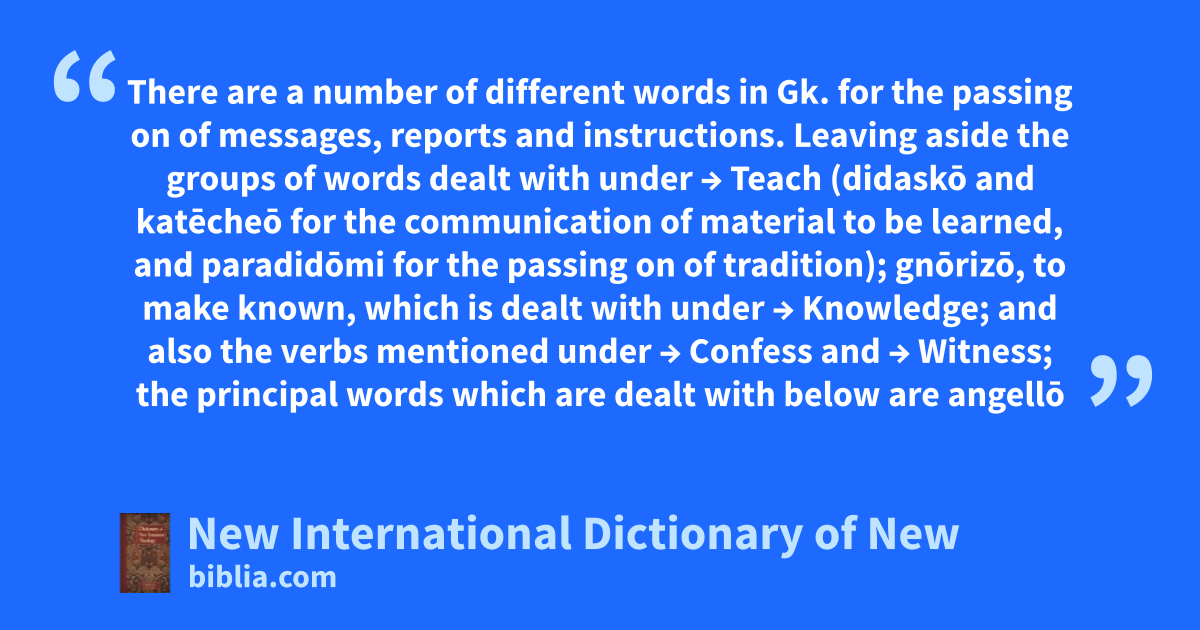 There are a number of different words in Gk. for the passing on of messages, reports and instructions. Leaving aside the groups of words dealt with under → Teach (didaskō and katēcheō for the communication of material to be learned, and paradidōmi for the passing on of tradition); gnōrizō, to make known, which is dealt with under → Knowledge; and also the verbs mentioned under → Confess and → Witness; the principal words which are dealt with below are angellō