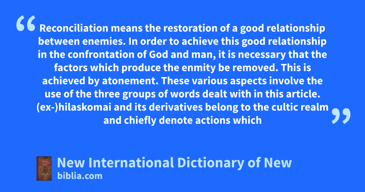 Reconciliation means the restoration of a good relationship between enemies. In order to achieve this good relationship in the confrontation of God and man, it is necessary that the factors which produce the enmity be removed. This is achieved by atonement. These various aspects involve the use of the three groups of words dealt with in this article. (ex-)hilaskomai and its derivatives belong to the cultic realm and chiefly denote actions which