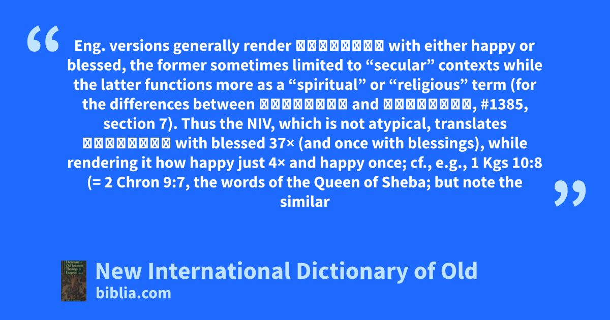 Eng. versions generally render אַשְׁרֵי with either happy or blessed, the former sometimes limited to “secular” contexts while the latter functions more as a “spiritual” or “religious” term (for the differences between אַשְׁרֵי and בָּרוּךְ, #1385, section 7). Thus the NIV, which is not atypical, translates אַשְׁרֵי with blessed 37× (and once with blessings), while rendering it how happy just 4× and happy once; cf., e.g., 1 Kgs 10:8 (= 2 Chron 9:7, the words of the Queen of Sheba; but note the similar