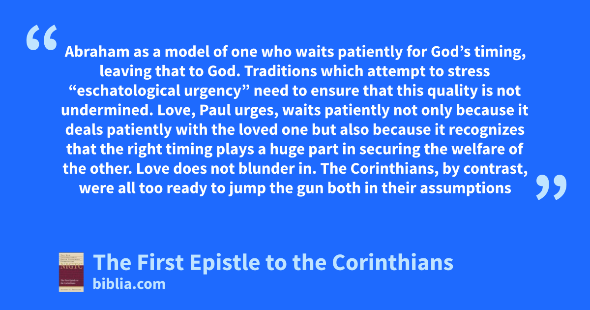 Abraham as a model of one who waits patiently for God’s timing, leaving that to God. Traditions which attempt to stress “eschatological urgency” need to ensure that this quality is not undermined. Love, Paul urges, waits patiently not only because it deals patiently with the loved one but also because it recognizes that the right timing plays a huge part in securing the welfare of the other. Love does not blunder in. The Corinthians, by contrast, were all too ready to jump the gun both in their assumptions