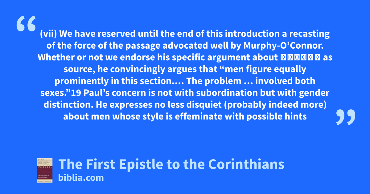 (vii) We have reserved until the end of this introduction a recasting of the force of the passage advocated well by Murphy-O’Connor. Whether or not we endorse his specific argument about κεφαλή as source, he convincingly argues that “men figure equally prominently in this section.… The problem … involved both sexes.”19 Paul’s concern is not with subordination but with gender distinction. He expresses no less disquiet (probably indeed more) about men whose style is effeminate with possible hints