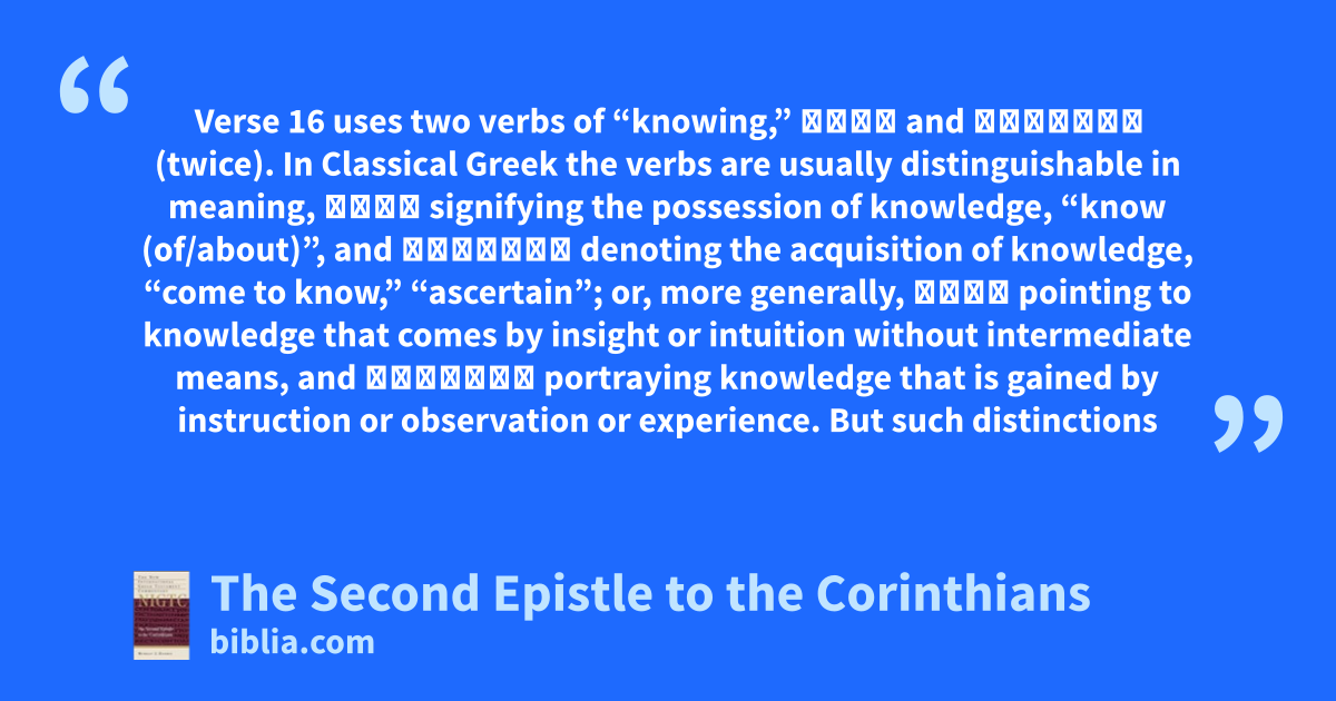 Verse 16 uses two verbs of “knowing,” οἶδα and γινώσκω (twice). In Classical Greek the verbs are usually distinguishable in meaning, οἶδα signifying the possession of knowledge, “know (of/about)”, and γινώσκω denoting the acquisition of knowledge, “come to know,” “ascertain”; or, more generally, οἶδα pointing to knowledge that comes by insight or intuition without intermediate means, and γινώσκω portraying knowledge that is gained by instruction or observation or experience. But such distinctions