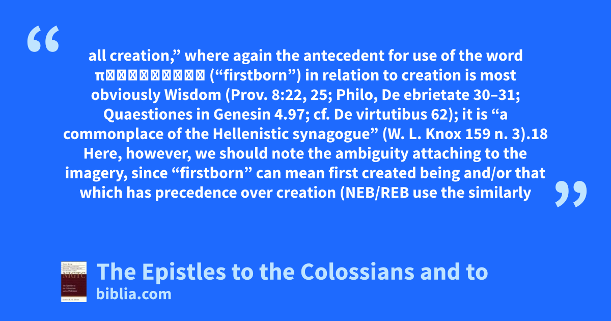all creation,” where again the antecedent for use of the word πρωτότοκος (“firstborn”) in relation to creation is most obviously Wisdom (Prov. 8:22, 25; Philo, De ebrietate 30–31; Quaestiones in Genesin 4.97; cf. De virtutibus 62); it is “a commonplace of the Hellenistic synagogue” (W. L. Knox 159 n. 3).18 Here, however, we should note the ambiguity attaching to the imagery, since “firstborn” can mean first created being and/or that which has precedence over creation (NEB/REB use the similarly