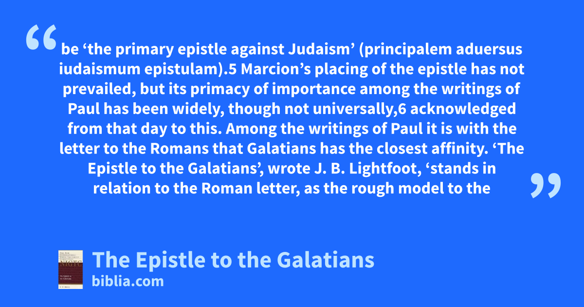 be ‘the primary epistle against Judaism’ (principalem aduersus iudaismum epistulam).5 Marcion’s placing of the epistle has not prevailed, but its primacy of importance among the writings of Paul has been widely, though not universally,6 acknowledged from that day to this. Among the writings of Paul it is with the letter to the Romans that Galatians has the closest affinity. ‘The Epistle to the Galatians’, wrote J. B. Lightfoot, ‘stands in relation to the Roman letter, as the rough model to the