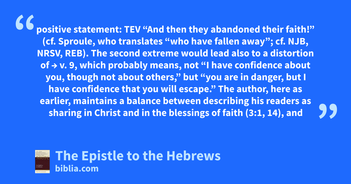 positive statement: TEV “And then they abandoned their faith!” (cf. Sproule, who translates “who have fallen away”; cf. NJB, NRSV, REB). The second extreme would lead also to a distortion of → v. 9, which probably means, not “I have confidence about you, though not about others,” but “you are in danger, but I have confidence that you will escape.” The author, here as earlier, maintains a balance between describing his readers as sharing in Christ and in the blessings of faith (3:1, 14), and