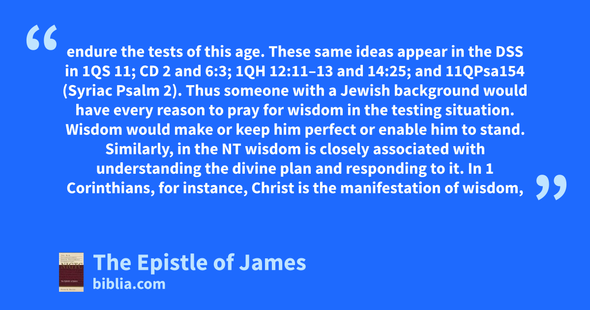 endure the tests of this age. These same ideas appear in the DSS in 1QS 11; CD 2 and 6:3; 1QH 12:11–13 and 14:25; and 11QPsa154 (Syriac Psalm 2). Thus someone with a Jewish background would have every reason to pray for wisdom in the testing situation. Wisdom would make or keep him perfect or enable him to stand. Similarly, in the NT wisdom is closely associated with understanding the divine plan and responding to it. In 1 Corinthians, for instance, Christ is the manifestation of wisdom,