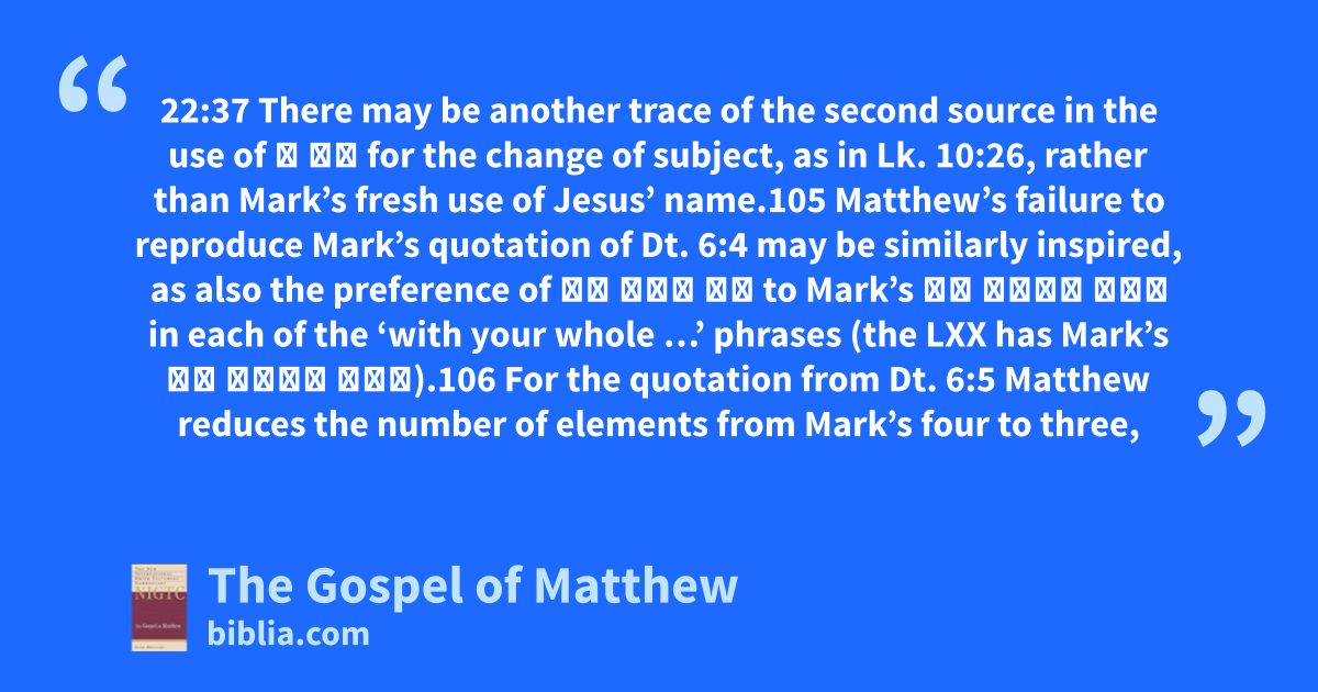 22:37 There may be another trace of the second source in the use of ὁ δέ for the change of subject, as in Lk. 10:26, rather than Mark’s fresh use of Jesus’ name.105 Matthew’s failure to reproduce Mark’s quotation of Dt. 6:4 may be similarly inspired, as also the preference of ἐν ὅλῃ τῇ to Mark’s ἐξ ὅλης τῆς in each of the ‘with your whole …’ phrases (the LXX has Mark’s ἐξ ὅλης τῆς).106 For the quotation from Dt. 6:5 Matthew reduces the number of elements from Mark’s four to three,