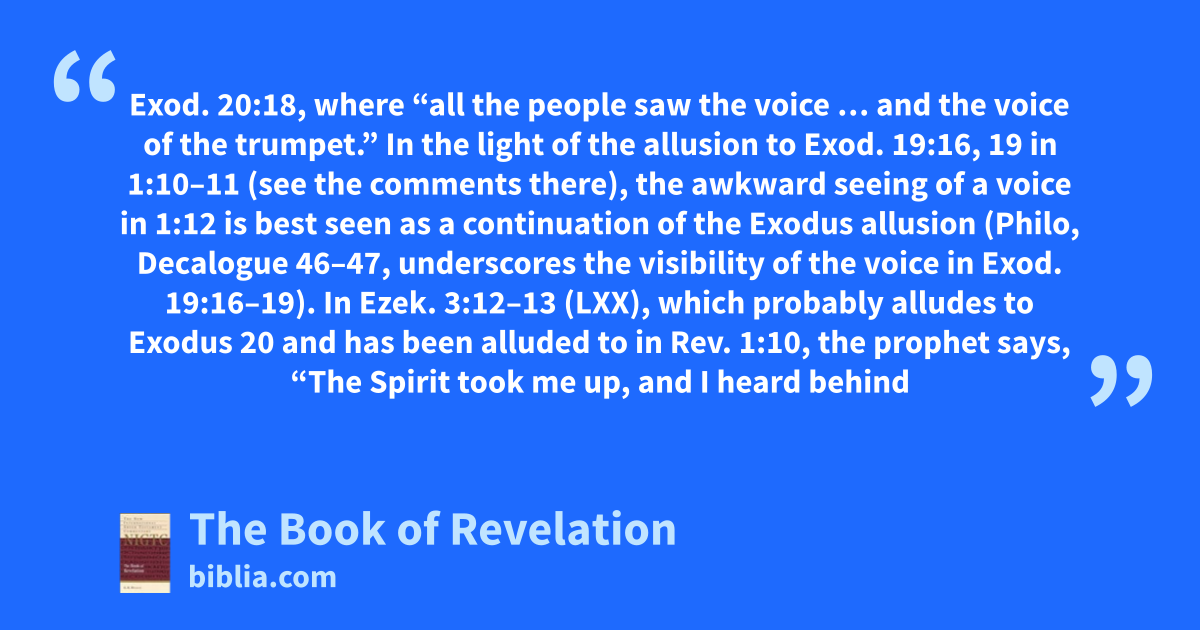 Exod. 20:18, where “all the people saw the voice … and the voice of the trumpet.” In the light of the allusion to Exod. 19:16, 19 in 1:10–11 (see the comments there), the awkward seeing of a voice in 1:12 is best seen as a continuation of the Exodus allusion (Philo, Decalogue 46–47, underscores the visibility of the voice in Exod. 19:16–19). In Ezek. 3:12–13 (LXX), which probably alludes to Exodus 20 and has been alluded to in Rev. 1:10, the prophet says, “The Spirit took me up, and I heard behind