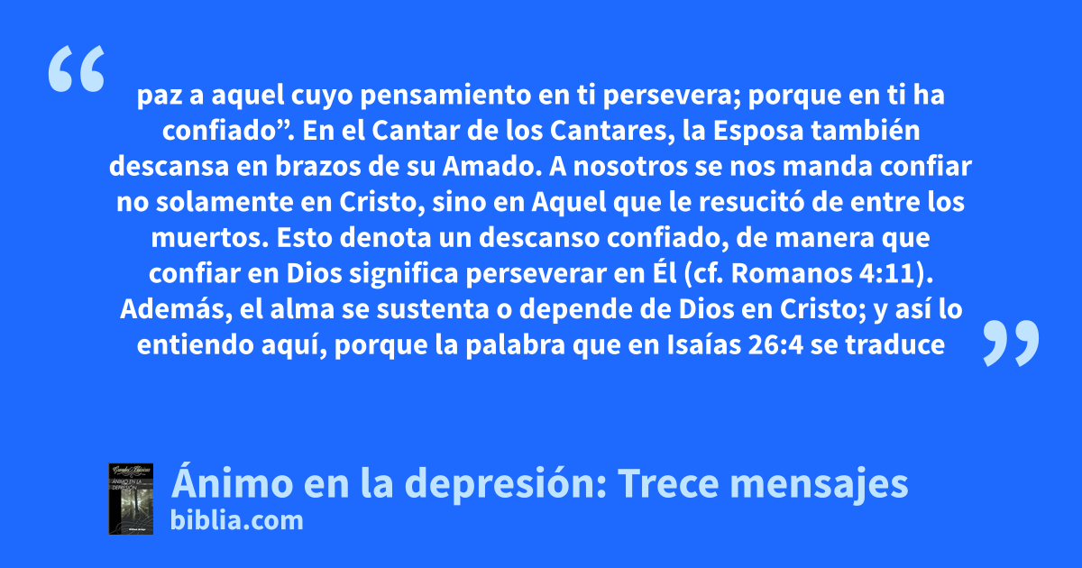 paz a aquel cuyo pensamiento en ti persevera; porque en ti ha confiado”. En el Cantar de los Cantares, la Esposa también descansa en brazos de su Amado. A nosotros se nos manda confiar no solamente en Cristo, sino en Aquel que le resucitó de entre los muertos. Esto denota un descanso confiado, de manera que confiar en Dios significa perseverar en Él (cf. Romanos 4:11). Además, el alma se sustenta o depende de Dios en Cristo; y así lo entiendo aquí, porque la palabra que en Isaías 26:4 se traduce