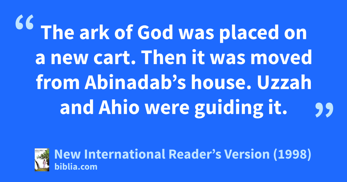 7The ark of God was placed on a new cart. Then it was moved from Abinadab’s house. Uzzah and Ahio were guiding it.