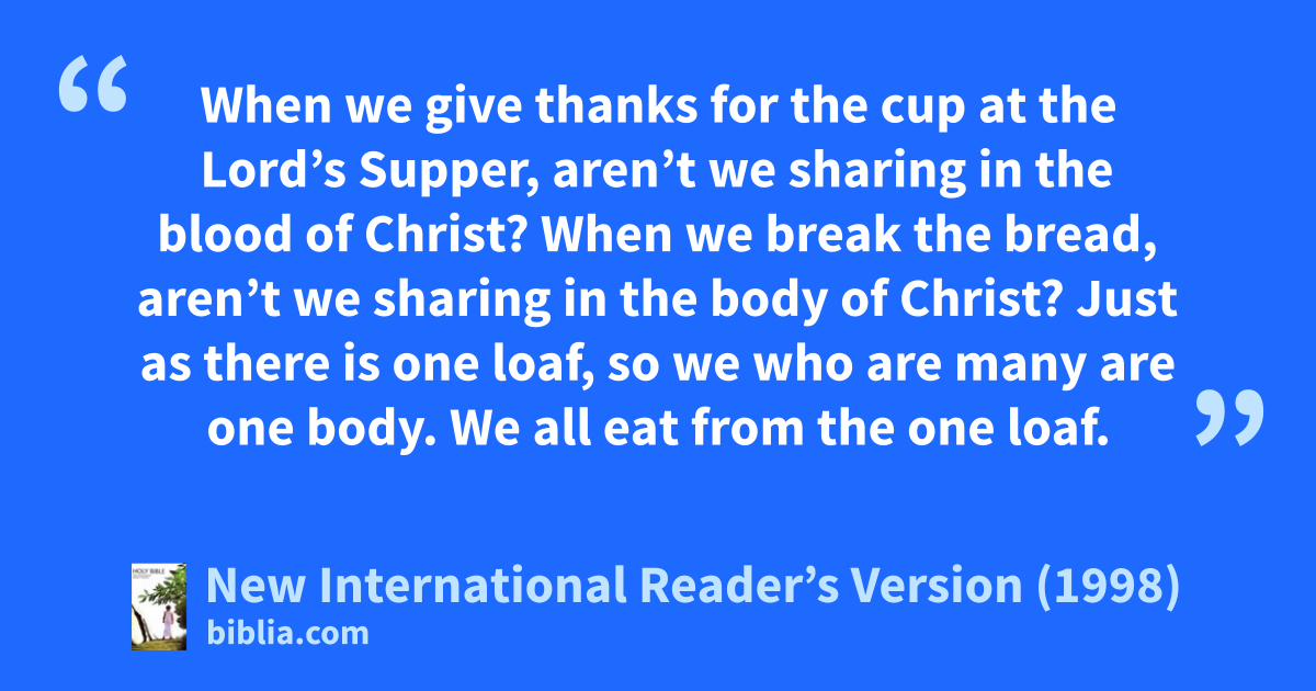 16When we give thanks for the cup at the Lord’s Supper, aren’t we sharing in the blood of Christ? When we break the bread, aren’t we sharing in the body of Christ? 17Just as there is one loaf, so we who are many are one body. We all eat from the one loaf.
