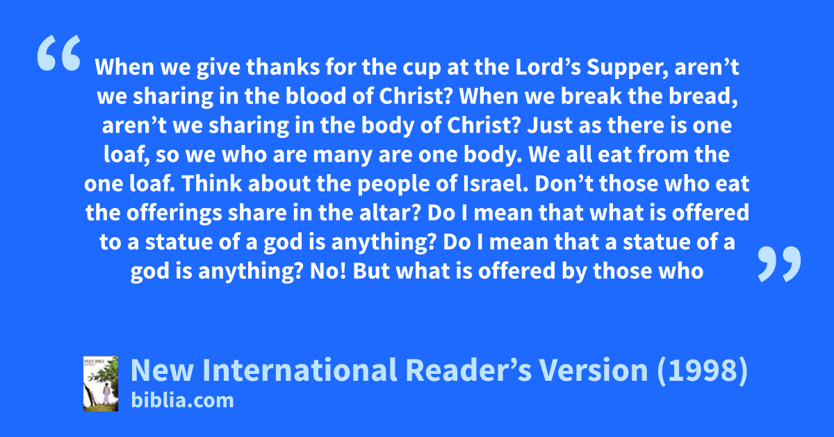 18Think about the people of Israel. Don’t those who eat the offerings share in the altar? 19Do I mean that what is offered to a statue of a god is anything? Do I mean that a statue of a god is anything? 20No! But what is offered by those who worship statues of gods is really offered to demons. It is not offered to God. I don’t want you to be sharing with demons.