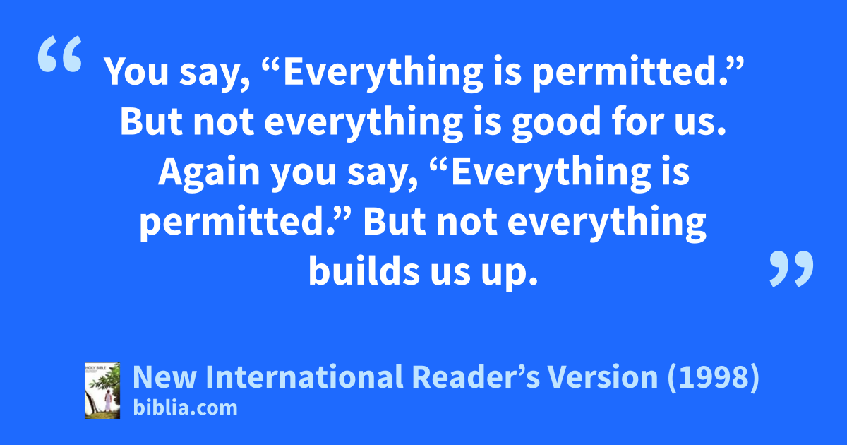 23You say, “Everything is permitted.” But not everything is good for us. Again you say, “Everything is permitted.” But not everything builds us up. 24We should not look out for our own interests. Instead, we should look out for the interests of others.
