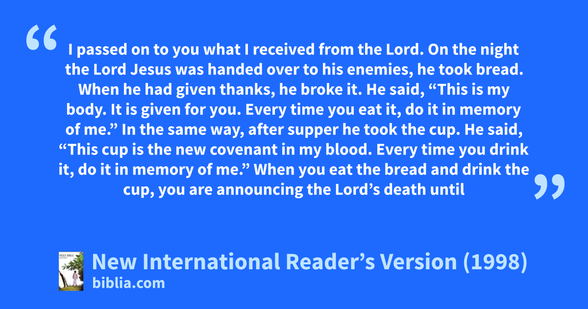 23I passed on to you what I received from the Lord. On the night the Lord Jesus was handed over to his enemies, he took bread. 24When he had given thanks, he broke it. He said, “This is my body. It is given for you. Every time you eat it, do it in memory of me.” 25In the same way, after supper he took the cup. He said, “This cup is the new covenant in my blood. Every time you drink it, do it in memory of me.”