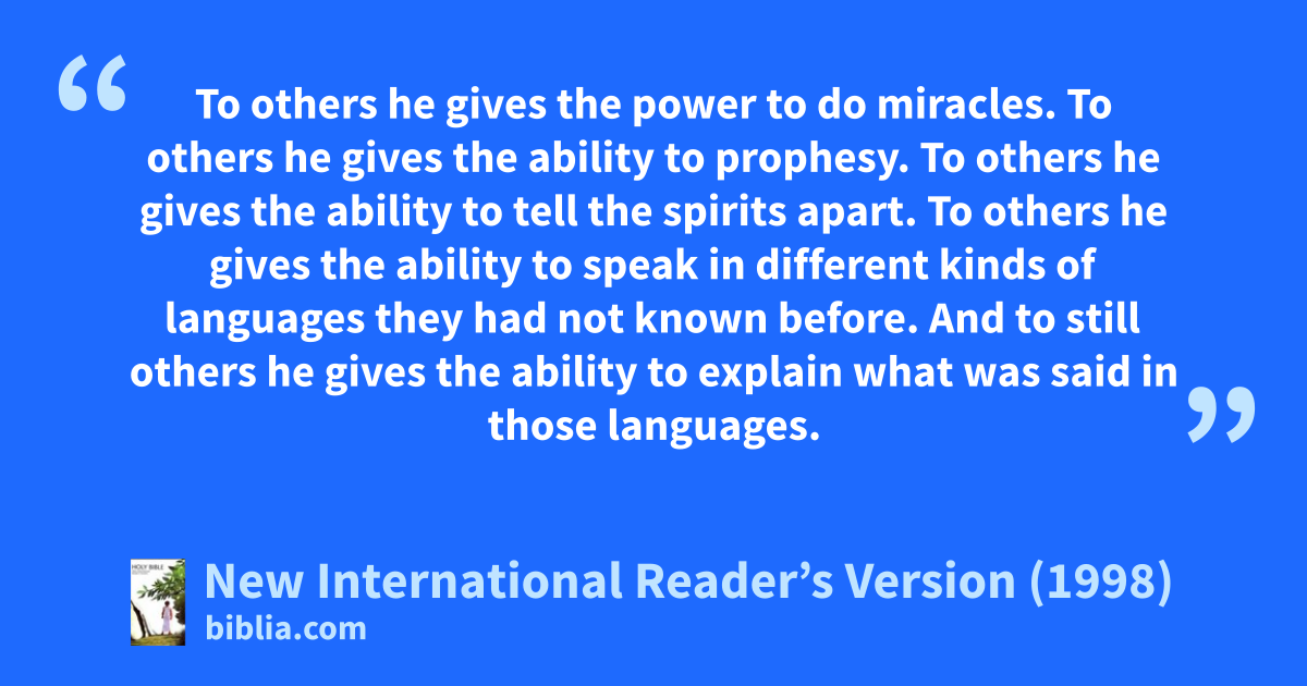 7The Holy Spirit is given to each of us in a special way. That is for the good of all. 8To some people the Spirit gives the message of wisdom. To others the same Spirit gives the message of knowledge. 9To others the same Spirit gives faith. To others that one Spirit gives gifts of healing. 10To others he gives the power to do miracles. To others he gives the ability to prophesy. To others he gives the ability to tell the spirits apart. To others he gives the ability to speak in different kinds of languages they had not known before. And to still others he gives the ability to explain what was said in those languages.