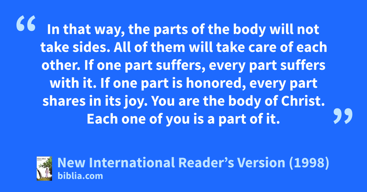 But God has joined together all the parts of the body. And he has given more honor to the parts that didn’t have any. 25In that way, the parts of the body will not take sides. All of them will take care of each other. 26If one part suffers, every part suffers with it. If one part is honored, every part shares in its joy.