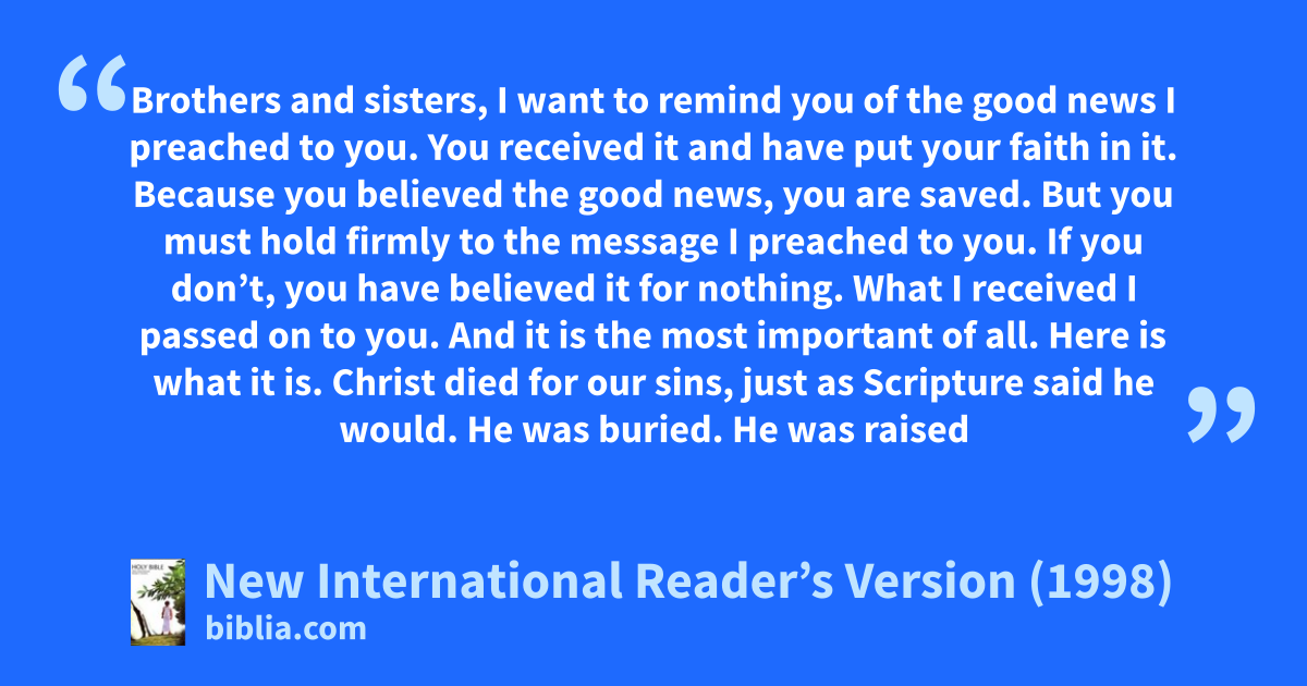 15 Brothers and sisters, I want to remind you of the good news I preached to you. You received it and have put your faith in it. 2Because you believed the good news, you are saved. But you must hold firmly to the message I preached to you. If you don’t, you have believed it for nothing.