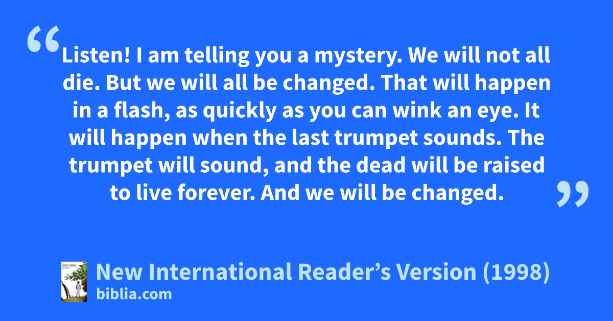 51Listen! I am telling you a mystery. We will not all die. But we will all be changed. 52That will happen in a flash, as quickly as you can wink an eye. It will happen when the last trumpet sounds. The trumpet will sound, and the dead will be raised to live forever. And we will be changed.