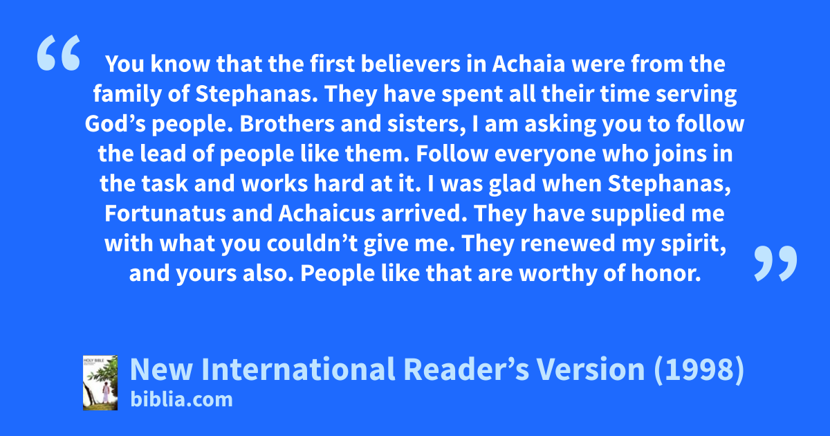 15You know that the first believers in Achaia were from the family of Stephanas. They have spent all their time serving God’s people. Brothers and sisters, I am asking you 16to follow the lead of people like them. Follow everyone who joins in the task and works hard at it.