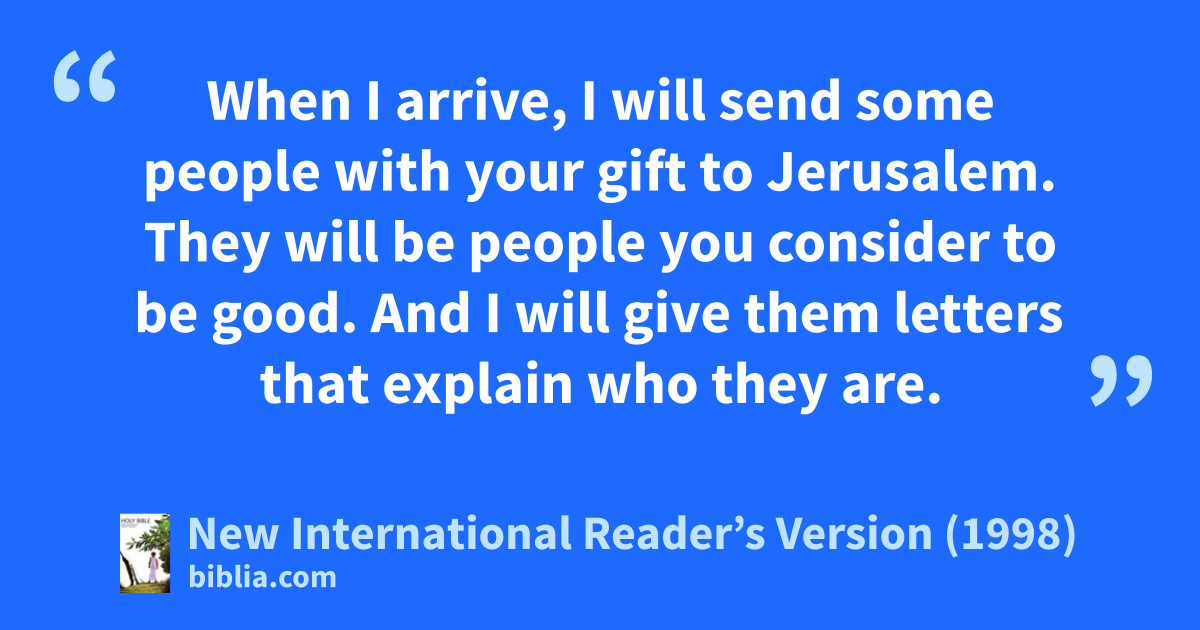 Do what I told the churches in Galatia to do. 2On the first day of every week, each of you should put some money away. The amount should be in keeping with how much money you make. Save the money so that you won’t have to take up an offering when I come. 3When I arrive, I will send some people with your gift to Jerusalem. They will be people you consider to be good. And I will give them letters that explain who they are. 4If it seems good for me to go also, they will go with me.