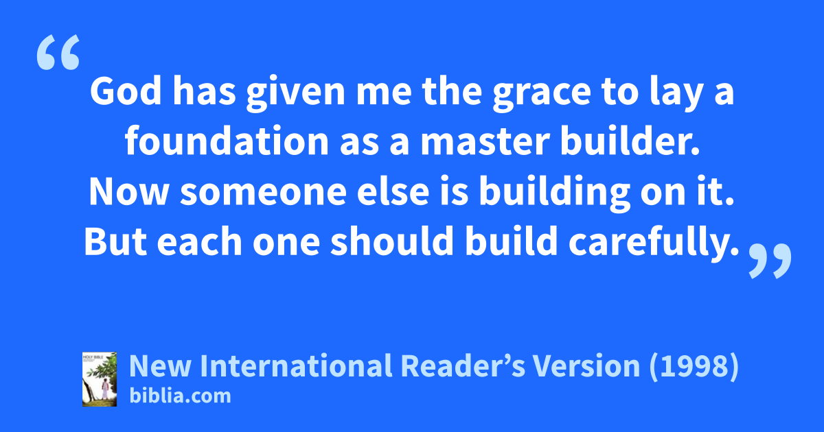 10God has given me the grace to lay a foundation as a master builder. Now someone else is building on it. But each one should build carefully. 11No one can lay any other foundation than the one that has already been laid. That foundation is Jesus Christ.