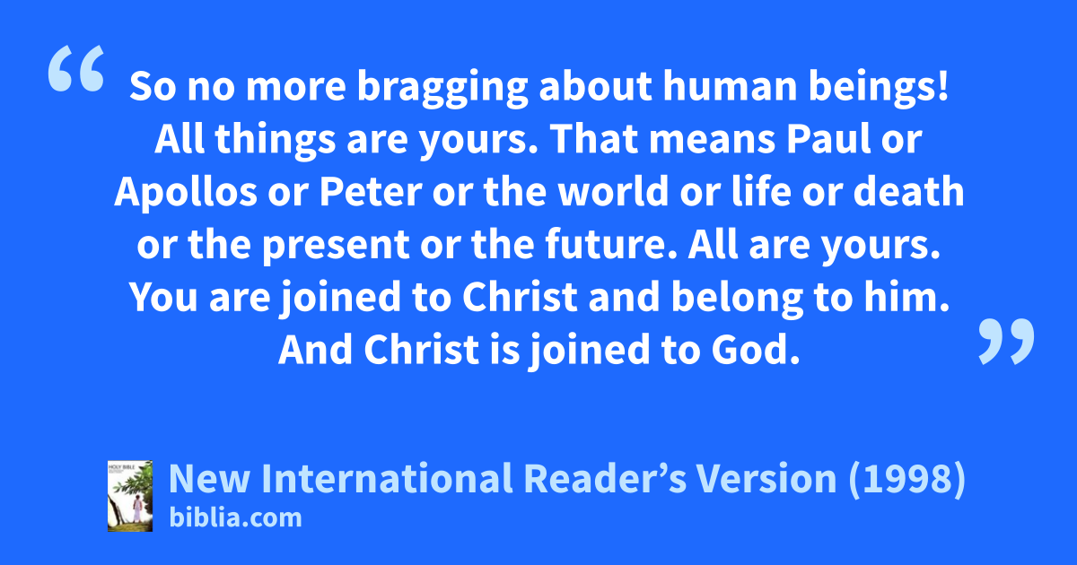 21So no more bragging about human beings! All things are yours. 22That means Paul or Apollos or Peter or the world or life or death or the present or the future. All are yours. 23You are joined to Christ and belong to him. And Christ is joined to God.