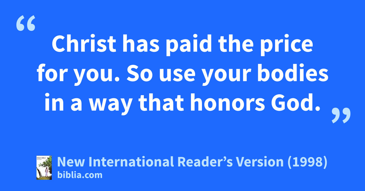 19Don’t you know that your bodies are temples of the Holy Spirit? The Spirit is in you. You have received him from God. You do not belong to yourselves. 20Christ has paid the price for you. So use your bodies in a way that honors God.